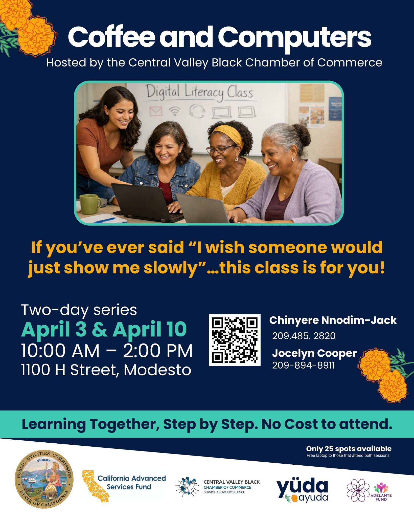 The Central Valley Black Chamber of Commerce invites members and the community to join this two-day workshop series focused on computer basics, real-world digital skills, and AI—without the hype. Computers and coffee will be provided in a friendly, hands-on learning environment.